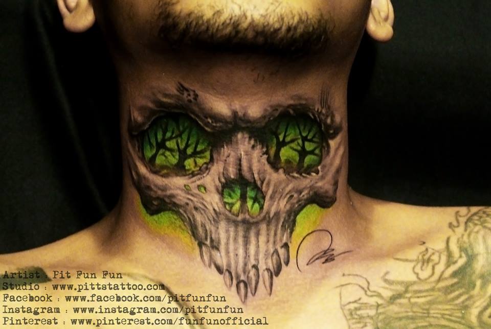 It includes a classic skull with a rose on its mouth. Types of skull tattoo designs. A skull tattoo design on a tribal background might look very effective. When it appears, it could be sharp reminder of death. The other symbols depicted in this body art creates another dimension to this classic skull idea. This tattoo includes a black and white inked skull with red ink filled in the eyes and mouth of. Amazing realism tattoo, a skull on the side of guys neck. Take a design featuring a native american chieftain on the side of the neck, for example. Diamond eyes sugar skull tattoo. But the chieftain's face needs to be centered as much as possible. Visible, painful and intimidating, the skull neck tattoo is reserved for guys willing to take the pain for this epic ink. For example, plenty of people choose to associate a human skull tattoo with giant eye sockets as a symbol of death, but this makes a fabulous tattoo idea as well. The back of the neck is a very popular place for a tattoo as it is both visible and can be covered with hair, scarves or collared shirts easily when you don't want it to be seen.